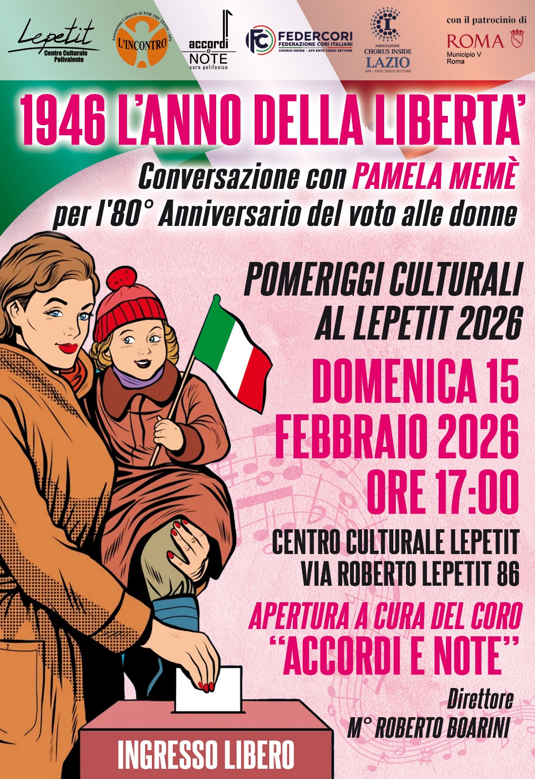 Domenica 15 febbraio, alle ore 17.00, nell'ambito dei pomeriggi culturali offerti dal Centro, verrà proposto "1946 L'anno della libertà", conversazione con Pamela Memè per l'80° anniversario del voto alle donne. L'apertura sarà a cura del coro "Accordi e note" diretto dal M° Roberto Boarini. Ingresso libero e gratuito. Siete tutti benvenuti.