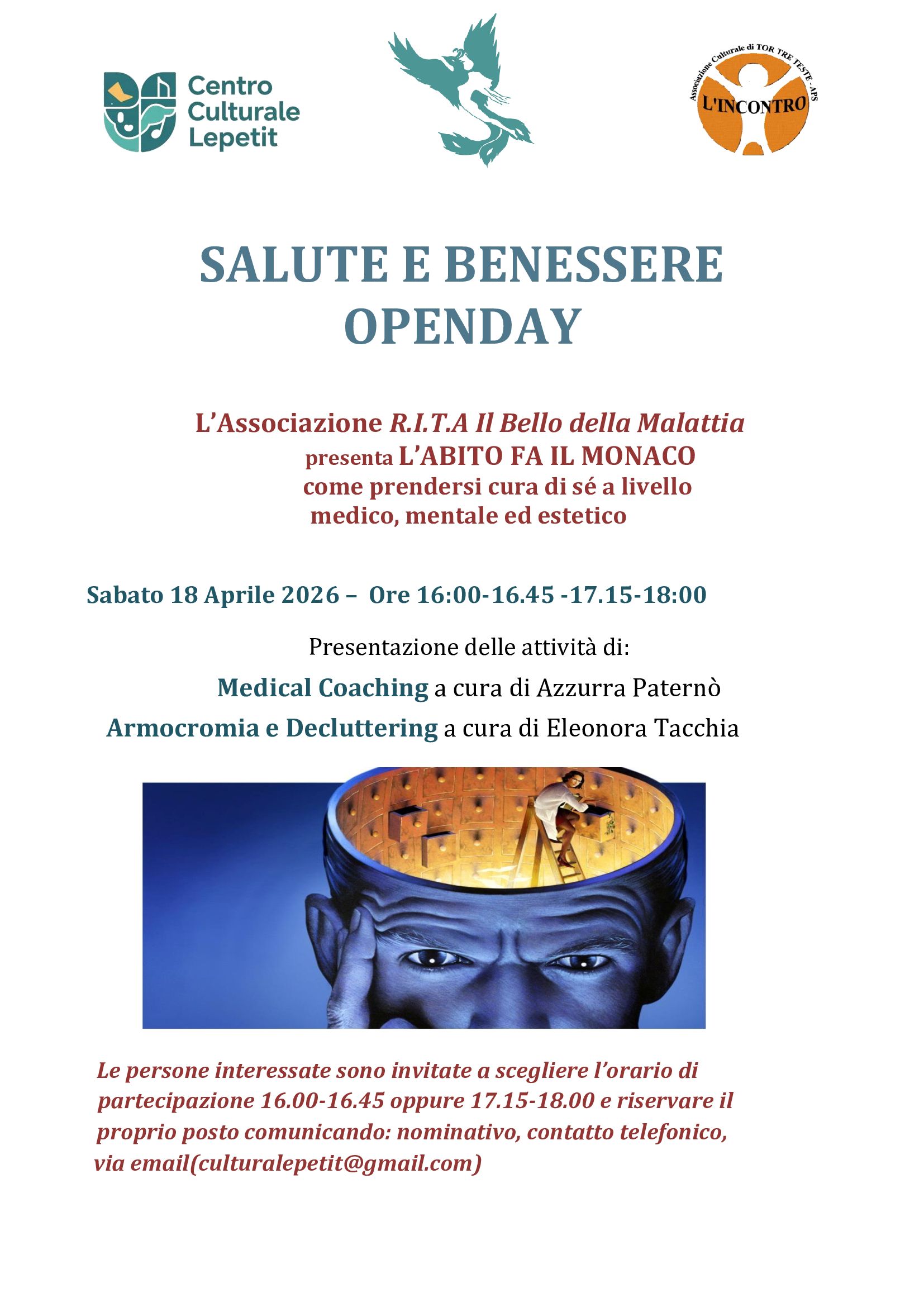 L’ OPENDAY prevederà 2 sessioni di 1.30 totale, 3 ore in cui saranno presentate l’attività di Medical Coaching e l’Armocromia, e si terrà Sabato 18 Aprile dalle ore 16 alle ore 16.45 e dalle ore 17.15 alle ore 18.00. Vedasi Locandina.